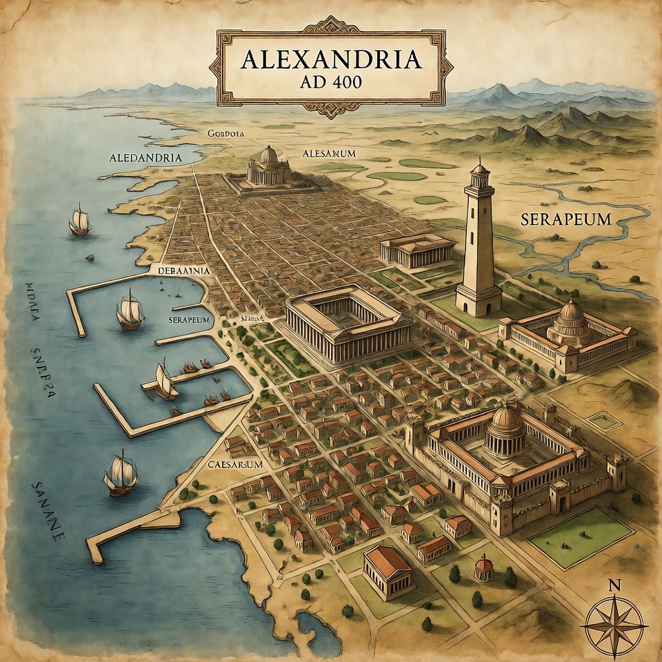 Александрия не е просто град – тя е сблъсък на три свята: елинската езическа философия, ранното християнство и римската политическа власт. В края на античността (4–5 век) това е място на жестоки конфликти. Според книгата на Кристофър Хаас „Александрия в късната античност: Топография и социален конфликт“, градът е разделен на религиозни и етнически квартали – евреи, езичници и християни живеят в постоянна борба за доминация. Християните, под ръководството на патриарси като Теофил и Кирил, разрушават езически храмове (като Серапеума през 392 г.), докато езичниците и евреите се съпротивляват.